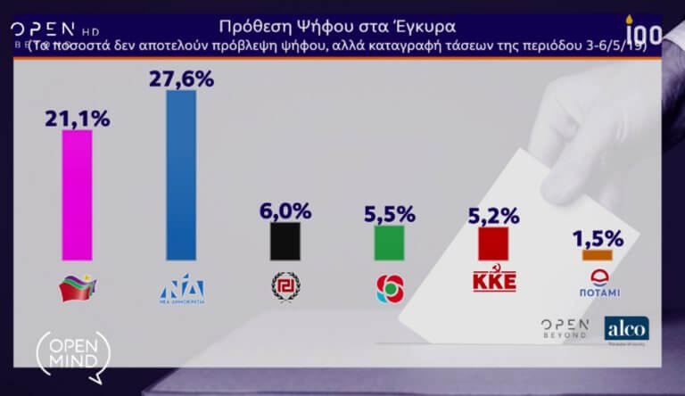 Η ΝΔ προηγείται στην πρόθεση ψήφου, με μια διαφορά της τάξης του 5,9%.
