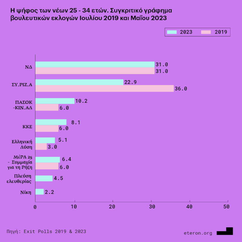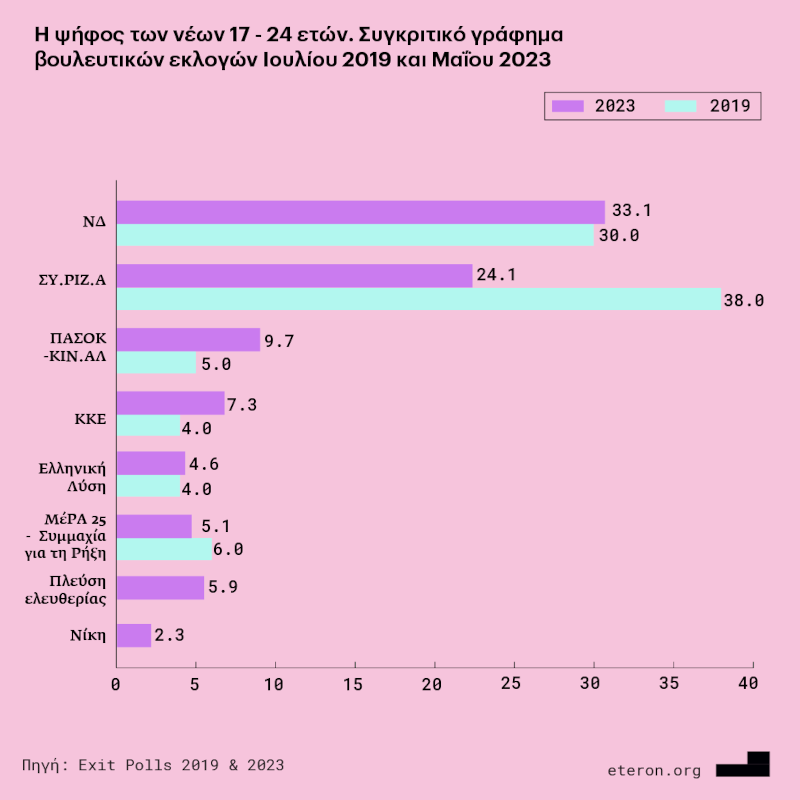 Τα στοιχεία έχουν αντληθεί από τα Exit Poll στις βουλευτικές εκλογές του 2019 και του 2023 και αναδεικνύονται τα αποτελέσματα των εκλογικών συνδυασμών: α/ στην ηλικιακή ομάδα 17 – 24 ετών, β/ σε όσες και όσους είναι φοιτητές/φοιτήτριες και γ/ στην ηλικιακή ομάδα 25 – 34 ετών.