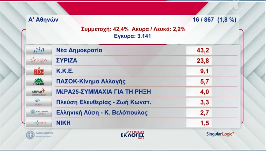 Σύμφωνα με τις πρώτα στοιχεία στην Α’ Αθήνας, σε 16 από 867 εκλογικά τμήματα (ποσοστό ενσωμάτωσης 1,8%) η ΝΔ συγκεντρώνει 43,2% (είχε πάρει 42% το 2019), ο ΣΥΡΙΖΑ 23,8% (από 31,29%, το ΚΚΕ 9,1% (από 6,37%), το ΠΑΣΟΚ 5,7% (από 5,1%), ΜέΡΑ 4%, Πλεύση 3,3% (από 1,51), Ελληνική Λύση 2,7%, ΝΙΚΗ 1,5%.
