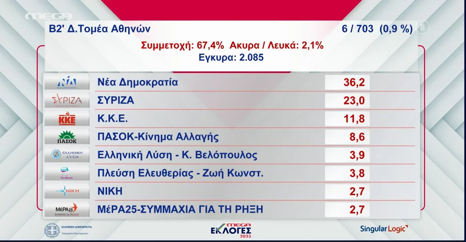 Στον Β2 Δυτικό Τομέα Αθηνών σε 6 από τα 703 τμήματα (ενσωμάτωση 0,9%) η ΝΔ συγκεντρώνει 36,2%, ο ΣΥΡΙΖΑ 23%, το ΚΚΕ 11,8%, το ΠΑΣΟΚ 8,6%, Ελλ. Λύση 3,9%, Πλεύση 3,8%, ΝΙΚΗ 2,7%, ΜέΡΑ25 2,7%.