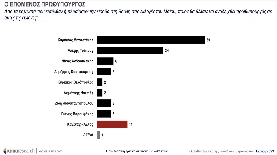Στο ερώτημα «από τα κόμματα που εισήλθαν ή πλησίασαν την είσοδο στη Βουλή στις εκλογές του Μαΐου, ποιος θα θέλατε να αναδειχθεί πρωθυπουργός σε αυτές τις εκλογές;», ο Κυριάκος Μητσοτάκης προηγείται με 39% έναντι του Αλέξη Τσίπρα που συγκεντρώνει 24%.