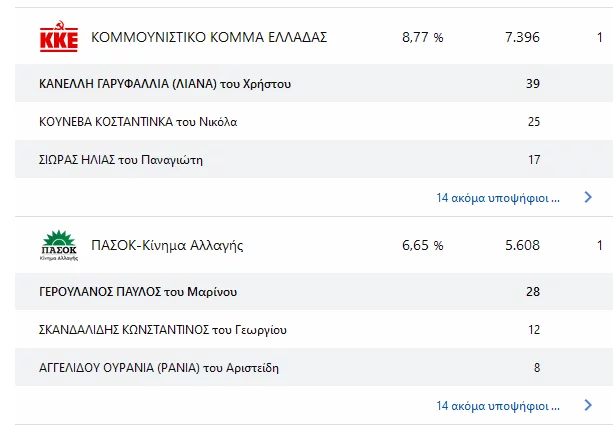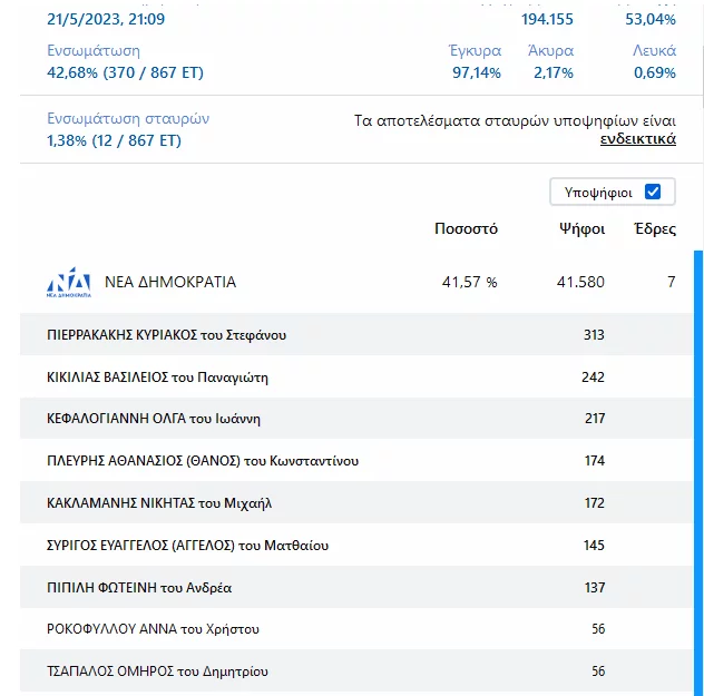Από το ψηφοδέλτιο της ΝΔ προηγείται ο Κυριάκος Πιερρακάκης και ακολουθούν Κικίλιας, Ο. Κεφαλογιάννης, Θ. Πλεύρης, Ν. Κακλαμάνης, Α. Συρίγος, και Φ. Πιπιλή και ακολουθεί η Άννα Ροκοφύλλου.