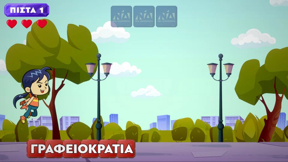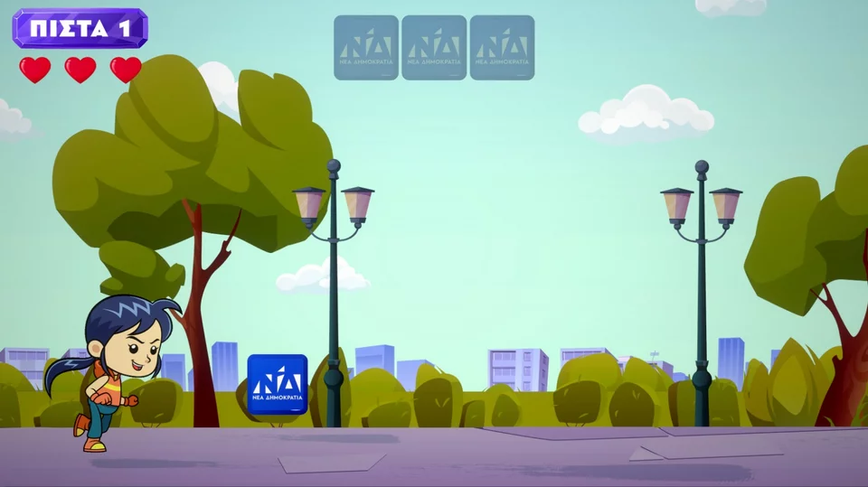 Ο παίκτης καλείται να υπερπηδήσει διάφορα εμπόδια προσπαθώντας να μην τον χτυπήσουν, ενώ ταυτόχρονα, καλείται να πιάσει το λογότυπο της ΝΔ. Αν μαζέψει αρκετά, περνάει την πίστα – και στο τέλος έχει μία μικρή έκπληξη.
