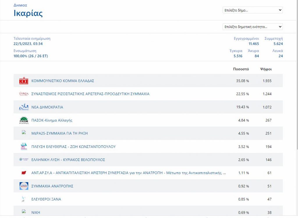 Το ΚΚΕ αναδείχθηκε πρώτο κόμμα στις εκλογές του 2023 στην Ικαρία, η οποία ανήκει στο νομό Σάμου και υπάγεται στην Περιφέρεια Βορείου Αιγαίου.