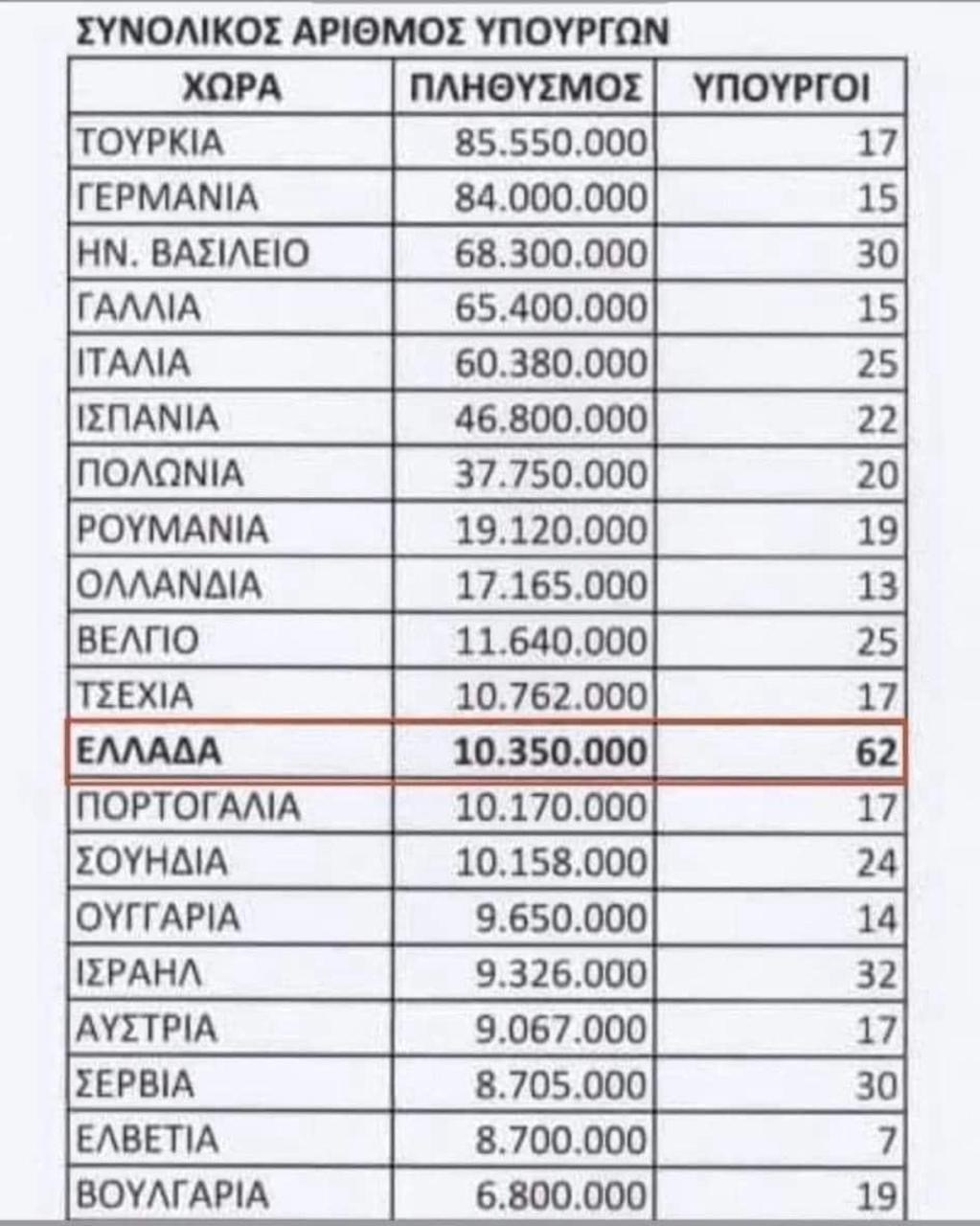 Η Ελλάδα με πληθυσμό μόλις 10 εκατομμυρίων και κάτι, έχει μία κυβέρνηση 62 υπουργών και υφυπουργών!