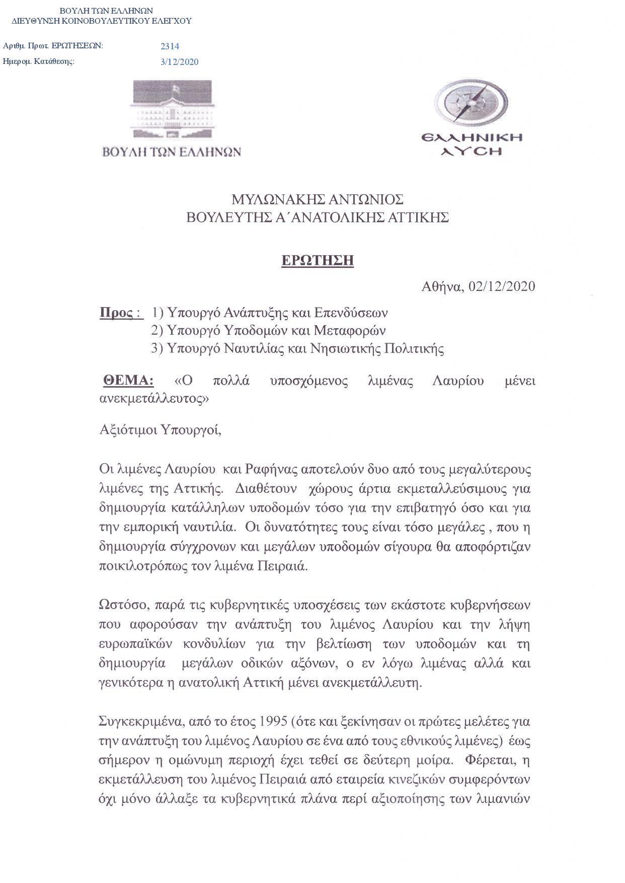 Η ερώτηση του βουλευτή της «Ελληνικής Λύσης», Αντώνη Μυλωνάκη: