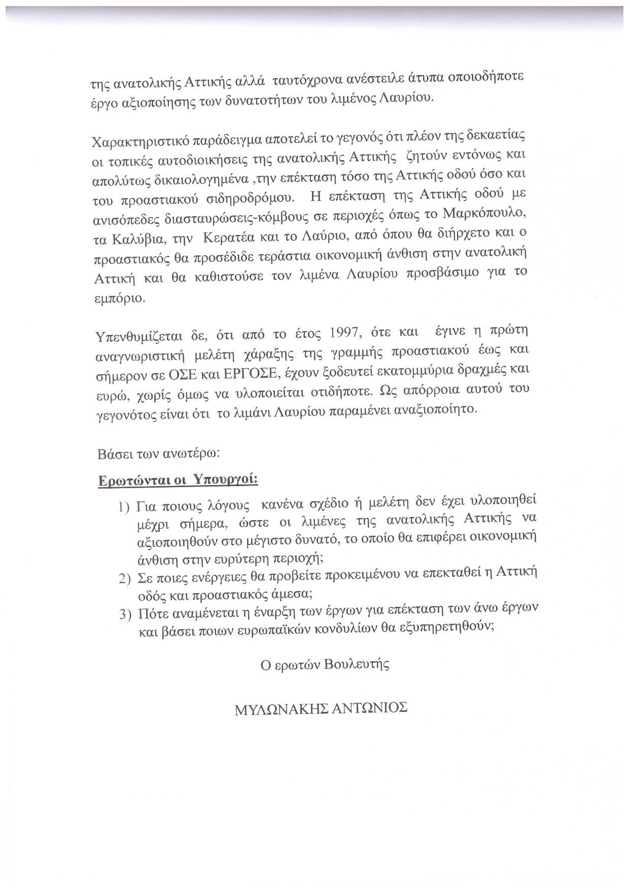 Μεγάλο πρόγραμμα για τους λιμένες Λαυρίου και Ραφήνας αλλά και για την επέκταση της Αττικής οδού και του προαστιακού, εξήγγειλε ο υπουργός Υποδομών και Μεταφορών, Κωνσταντίνος Αχ. Καραμανλής απαντώντας σε σχετικό ερώτημα του βουλευτή Ανατολικής Αττικής της «Ελληνικής Λύσης», Αντώνη Μυλωνάκη ο οποίος έχει δώσει μεγάλη μάχη για το θέμα στην βουλή.
