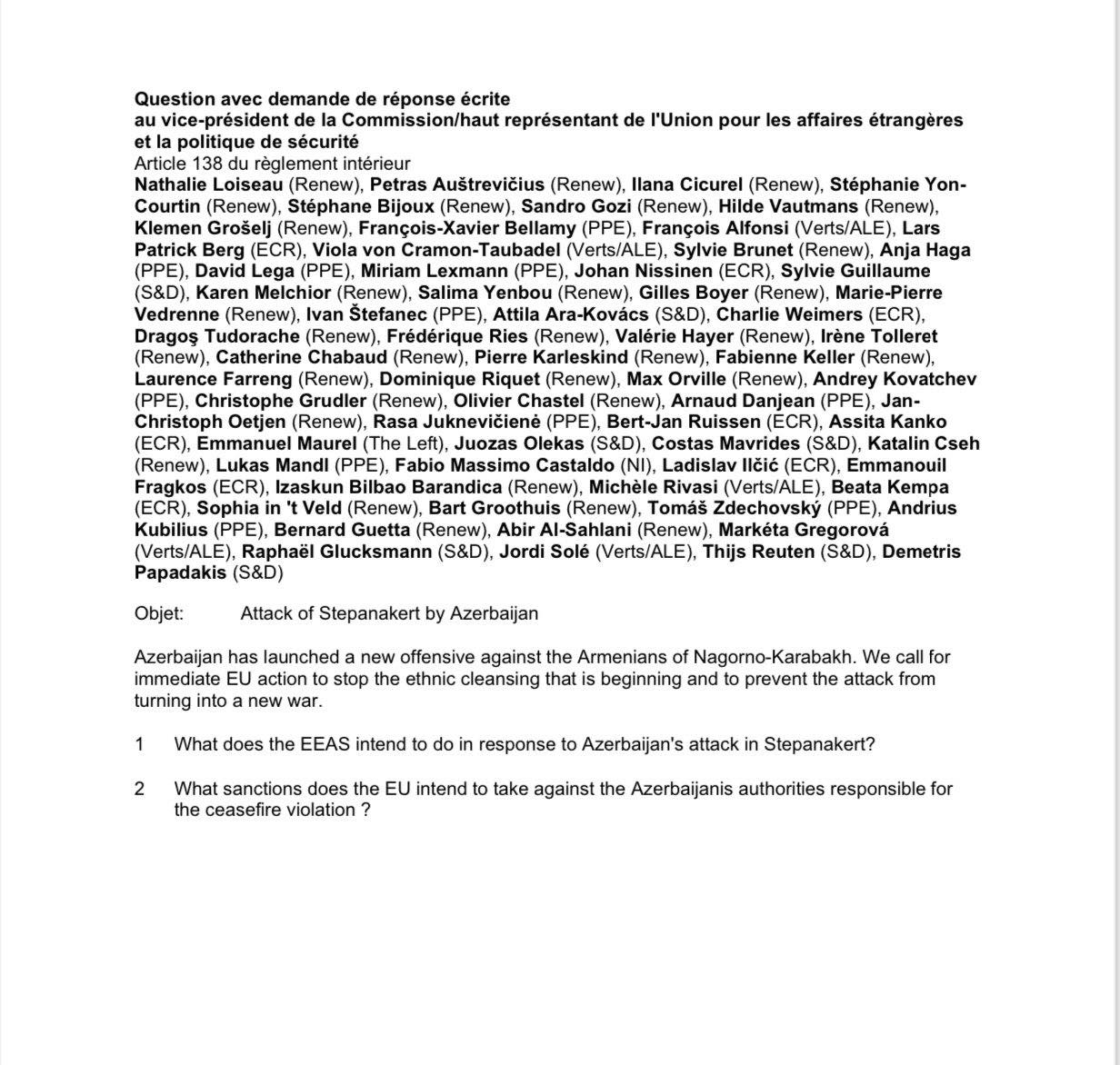 Οι Ευρωβουλευτές της Ελλάδας που δεν συνυπέγραψαν (κανένας!) το αίτημα για Κυρώσεις στο #Αζερμπαιτζάν δεν θεωρούν τους Αρμένιους συμμάχους μας;