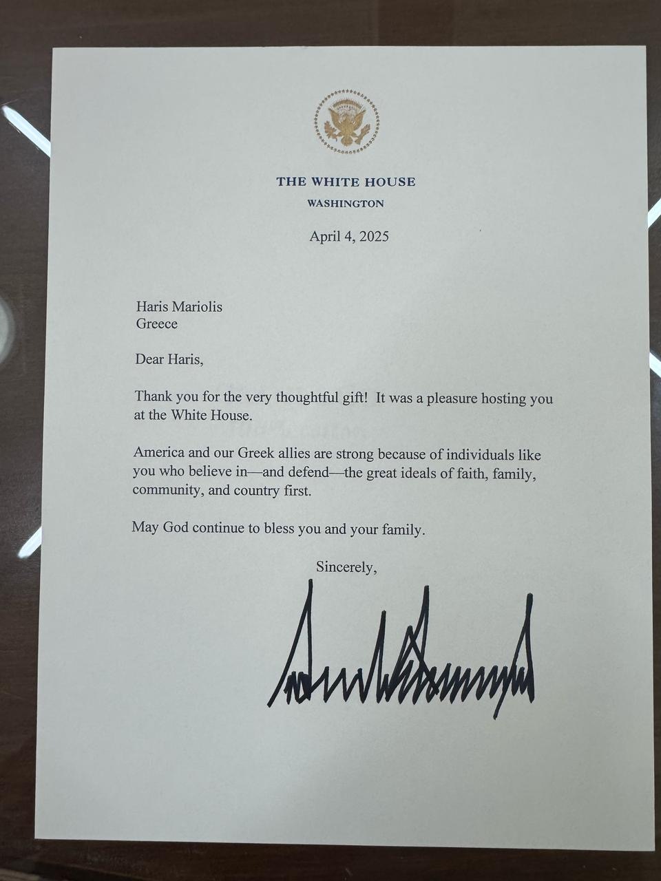 Ευχαριστήρια επιστολή απέστειλε ο Αμερικανός πρόεδρος Ν.Τραμπ προς τον πρόεδρο της Ε.Ο.Π. (Ελληνική Ομοσπονδία Πυγμαχίας) Χ.Μαριόλη για την παρουσία του στην επέτειο της 25ης Μαρτίου στον Λευκό Οίκο.