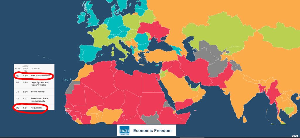 «Στους δείκτες (οικονομικής) ελευθερίας, η Ελλάδα βρίσκεται στη θέση 153 από τις 165 χώρες μέτρησης σε σχέση με το μέγεθος του κράτους και στη θέση 143 σε σχέση με τη νομοθεσία της. Στην ευρωπαϊκή γειτονιά μας, σε γενικότερους δείκτες ελευθερίας, βρίσκεται στην προτελευταία θέση μετά τη Βοσνία.