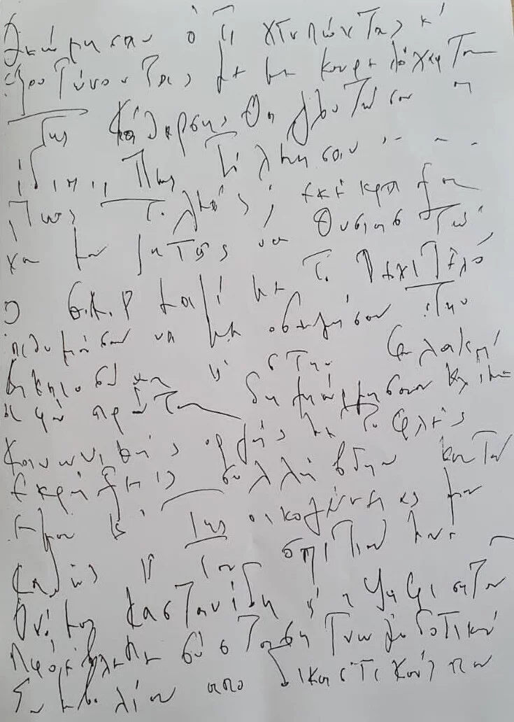 «Έχω πλήρη επίγνωση πλέον των όσων γράφω – αναφέρω – καταγγέλλω και έχουν λάβει χώρα από όλους αυτούς που εμφανίζονται υπεράνω. Έχω βιώσει την ασέβεια τον φθόνο το μίσος την ασπλαχνια και την κακιά των ανθρώπων Έχω βεβαιότητα για τον λόγο που βασανίστηκα και αιχμαλωτίστηκα και εγώ και η οικογένειά μου. Χρησιμοποιηθήκαμε για να ξεπλυθούν οι αμαρτίες πολλών. Ζητώ συγνώμη από την οικογένεια μου».