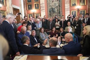 Περίπου 40 «γαλάζιοι» βουλευτές ανταποκρίθηκαν στο κάλεσμα του πρωθυπουργού για έναν χαλαρό καφέ, στο εντευκτήριο της Βουλής, όπου και ανακοίνωσε ότι οι εθνικές εκλογές θα γίνουν μετά το Πάσχα του 2027, το οποίο πέφτει στις 2 Μαΐου.