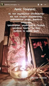 Η ίδια δημοσίευσε μια φωτογραφία με την εικόνα του Αγίου Γεωργίου, ένα αναμμένο καντήλι και μια κορνίζα του αδερφού της που έφυγε στα 45 του. Στη λεζάντα έγραψε το απολυτίκιο του Αγίου που σήμερα γιορτάζει.