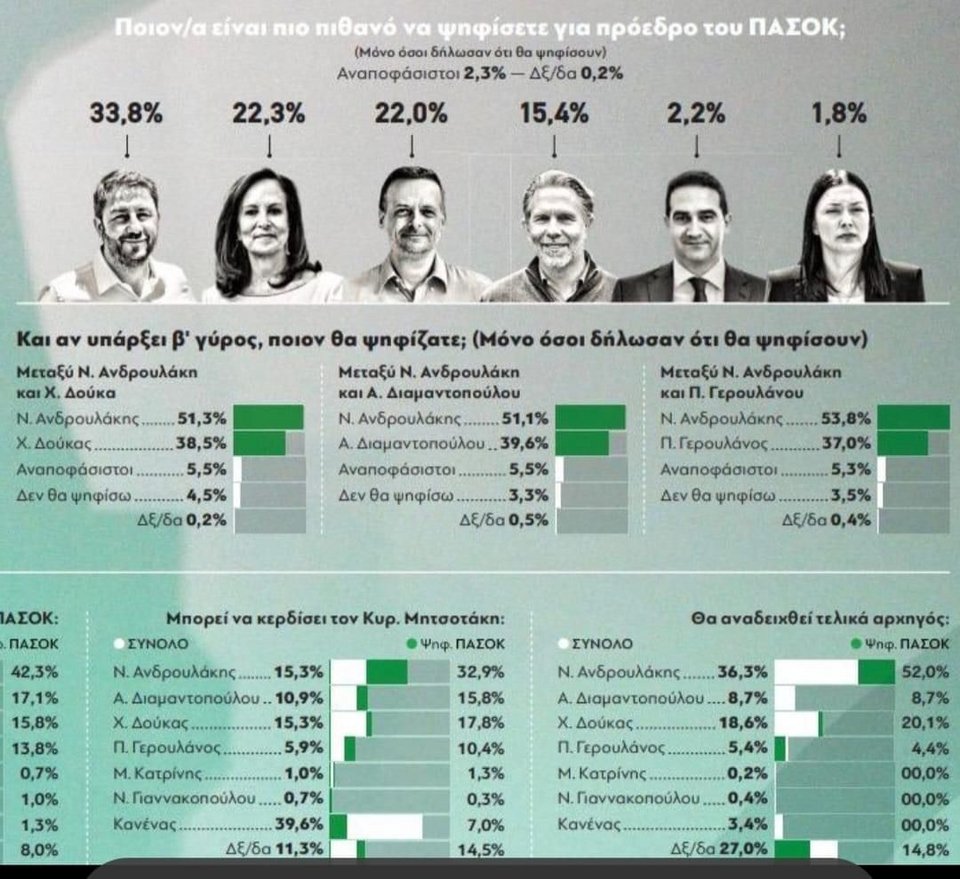 Η δημοσκόπηση διενεργήθηκε για λογαριασμό της εφημερίδας «Παραπολιτικά» και στο ερώτημα «ποιον/α είναι πιο πιθανό να ψηφίσετε για πρόεδρο του ΠΑΣΟΚ» οι ερωτώμενοι (μόνο όσοι δήλωσαν ότι θα ψηφίσουν) απάντησαν ως εξής: