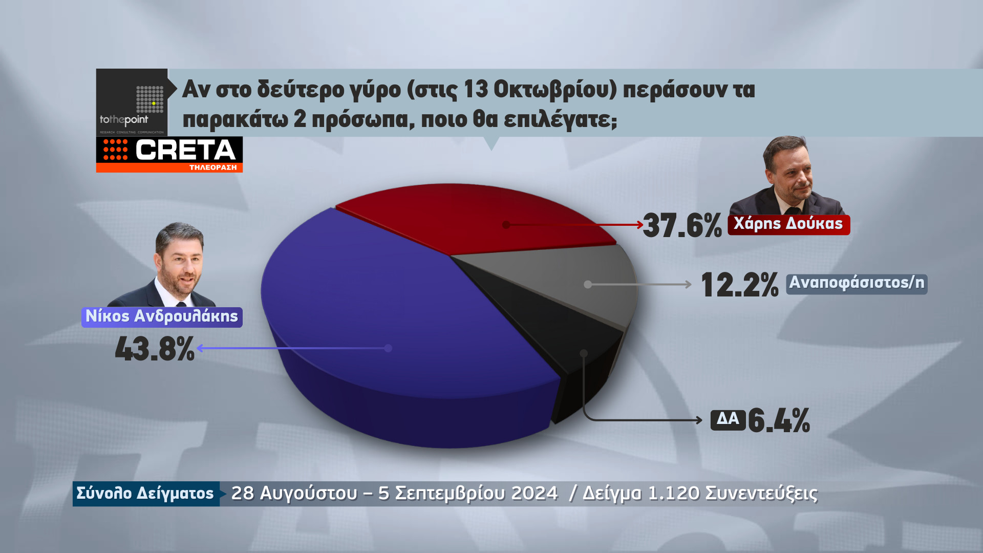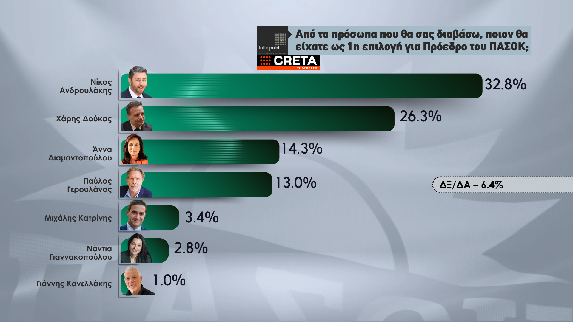 Σύμφωνα με τη δημοσκόπηση της εταιρείας «To the point» για λογαριασμό της «CRETA Τηλεόραση», ο Νίκος Ανδρουλάκης προηγείται στην πρόθεση ψήφου 32,8% και έπεται ο Χάρης Δούκας με 26,3%.