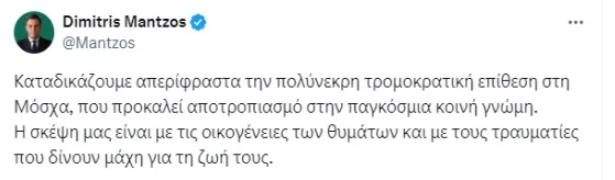 Ο Δημήτρης Μάντζος βουλευτής Επικρατείας του ΠΑΣΟΚ-Κινήματος Αλλαγής τονίζει ότι «Καταδικάζουμε απερίφραστα την πολύνεκρη τρομοκρατική επίθεση στη Μόσχα, που προκαλεί αποτροπιασμό στην παγκόσμια κοινή γνώμη».