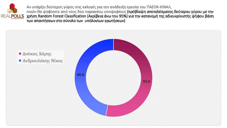 Νίκος Ανδρουλάκης, και Χάρης Δούκας καταλαμβάνουν τις δύο πρώτες θέσεις στην πρόθεση ψήφου με ποσοστό 25,6% και 23%, αντίστοιχα, ενώ ακολουθούν η Άννα Διαμαντοπούλου με 19,4%, ο Παύλος Γερουλάνος με 18,5%, Νάντια Γιαννακοπούλου με 3,8% και ο Μιχάλης Κατρίνης με 3,7%.