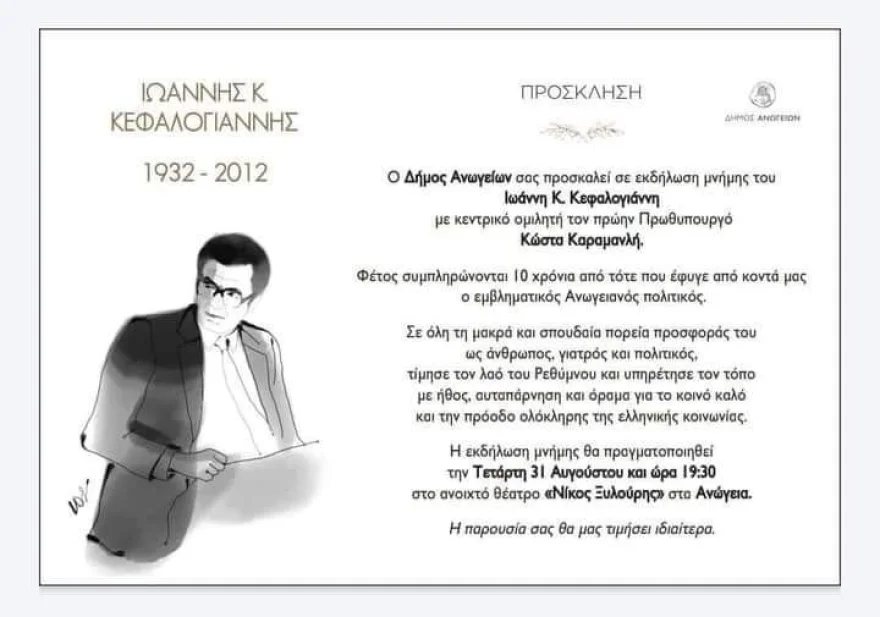 Κεντρικός ομιλητής σε εκδήλωση μνήμης του Δήμου Ανωγείων για τον Ιωάννη Κ. Κεφαλογιάννη, που θα πραγματοποιηθεί στις 31 Αυγούστου, θα είναι ο πρώην πρωθυπουργός Κώστας Καραμανλής.