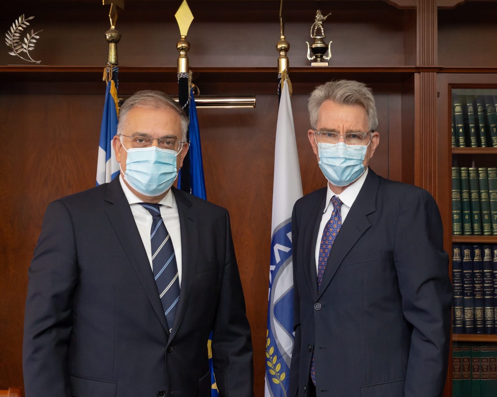 Eθιμοτυπική συνάντηση με τον Πρέσβη των ΗΠΑ στην Αθήνα κ. Τζέφρι Πάιατ είχε σήμερα στο Υπουργείο Προστασίας του Πολίτη ο κ. Τάκης Θεοδωρικάκος.
