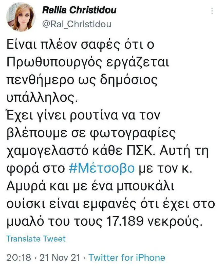 Συγκεκριμένα, όπως αναφέρει το γραφείο Τύπου τού πρωθυπουργού, η κυρία Χρηστίδου σε ανάρτησή της στα social media παρουσίασε επίσκεψη του Κυριάκου Μητσοτάκη στο Μέτσοβο ως χθεσινή, ενώ αυτή είχε πραγματοποιηθεί το 2019.