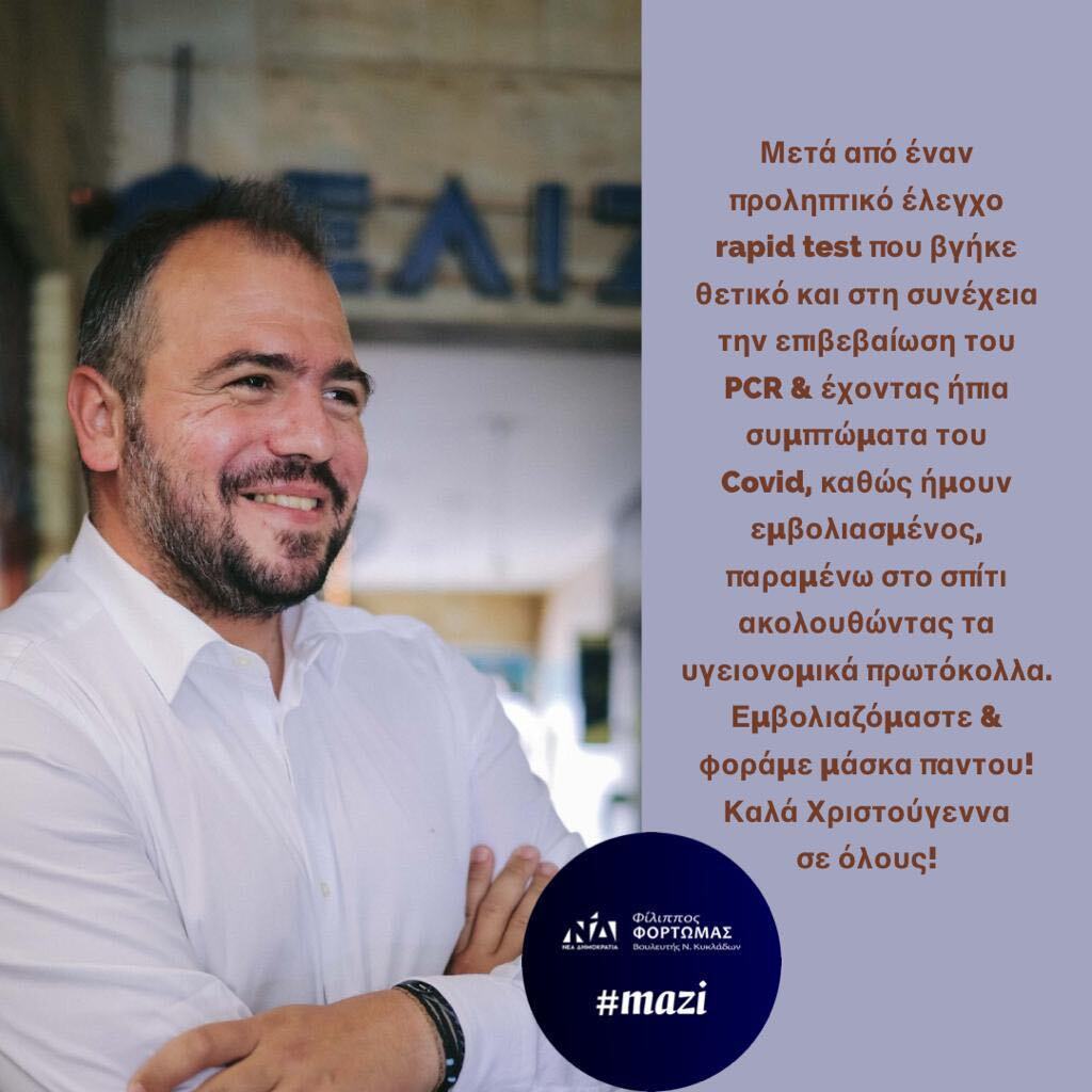 Τη σχετική ενημέρωση έκανε ο γραμματέας της Κοινοβουλευτικής Ομάδας Γιάννης Μπούγας, ευχόμενος στον βουλευτή γρήγορη ανάρρωση: «Οι βουλευτές της Κ.Ο της ΝΔ ευχόμαστε στον συνάδελφο βουλευτή Κυκλάδων #Φίλιππο #Φόρτωμα, που νοσηλεύεται με κορονοϊό στη ΜΕΘ του 251 Γενικού Νοσοκομείου Αεροπορίας γρήγορη ανάρρωση. Οι σκέψεις και οι ευχές μας τον συνοδεύουν. Τον περιμένουμε σύντομα να επιστρέψει υγιής και δυνατός κοντά μας στα κοινοβουλευτικά του καθήκοντα».