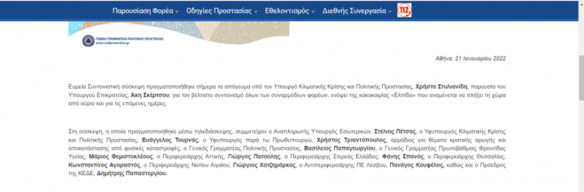 «Ευρεία Συντονιστική σύσκεψη πραγματοποιήθηκε σήμερα το απόγευμα υπό τον Υπουργό Κλιματικής Κρίσης και Πολιτικής Προστασίας, Χρήστο Στυλιανίδη, παρουσία του Υπουργού Επικρατείας, Άκη Σκέρτσου, για τον βέλτιστο συντονισμό όλων των συναρμόδιων φορέων, ενόψει της κακοκαιρίας «Ελπίδα» που αναμένεται να πλήξει τη χώρα από αύριο και για τις επόμενες ημέρες».
