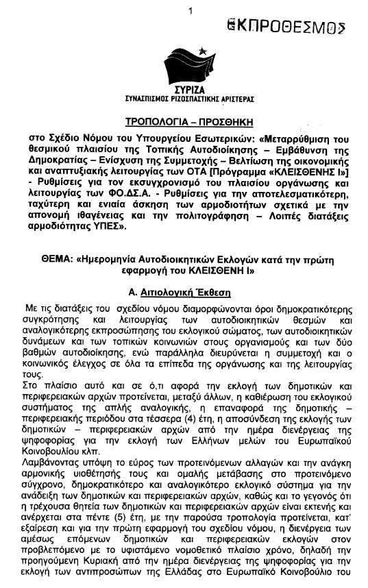 «Προτείνεται κατ’ εξαίρεση και για πρώτη εφαρμογή του σχεδίου νόμου (Κλεισθένης) η διενέργεια των αμέσως επόμενων δημοτικών και περιφερειακών εκλογών στον προβλεπόμενο με το υφιστάμενο νομοθετικό χρόνο, δηλαδή την προηγούμενη Κυριακή από την ημέρα διενέργειας ψηφοφορίας για την επιλογή των αντιπροσώπων της Ελλάδας στο Ευρωπαϊκό Κοινοβούλιο του έτους 2019 και η εγκατάσταση των νέων δημοτικών και περιφερειακών αρχών να γίνει την 1η Σεπτεμβρίου του 2019 και να λήγει την 31η Δεκεμβρίου του 2023».
