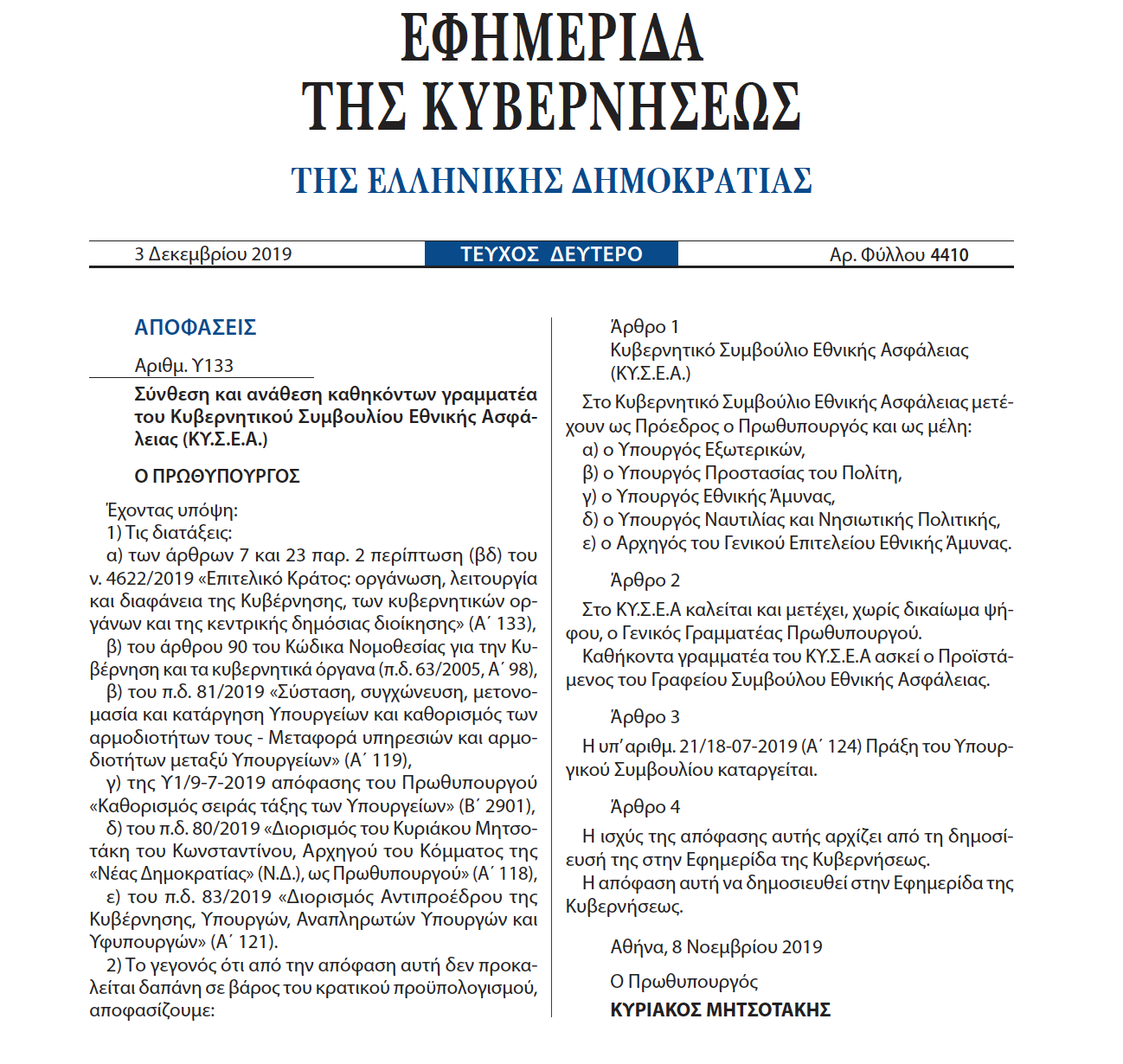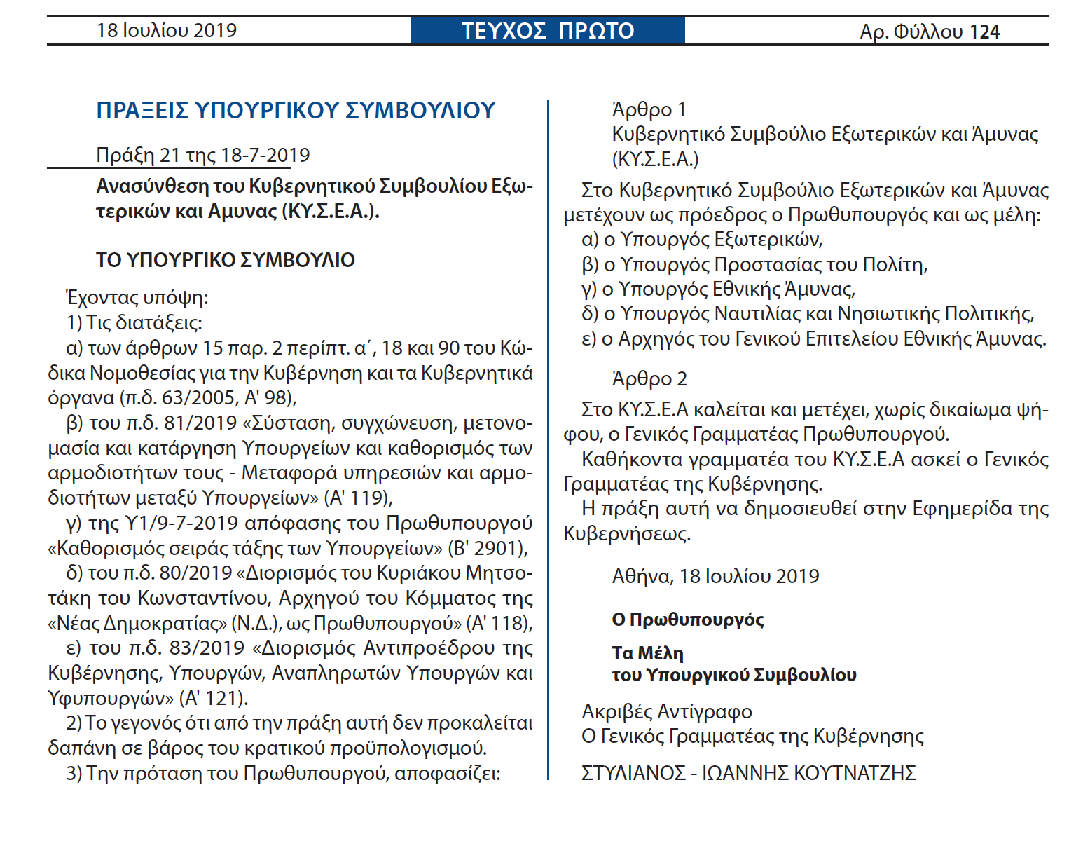 Τον Ιούλιο λίγες ημέρες μετά από τις εκλογές το υπουργικό συμβούλιο είχε αποφασίσει για την ανασύνθεση του ΚΥΣΕΑ. Με το Α να είναι ακόμη της Άμυνας…