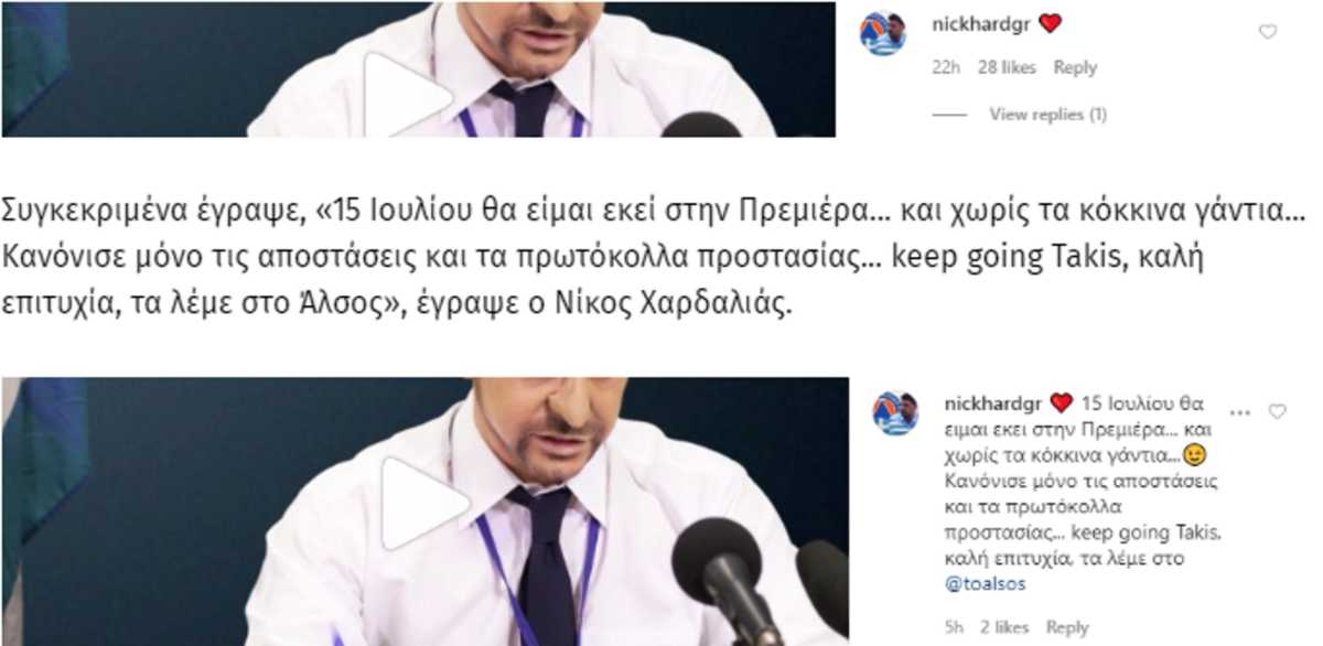 Μάλιστα, ο Νίκος Χαρδαλιάς δεν δίστασε να απαντήσει στον Τάκη Ζαχαράτο στο Instagram.