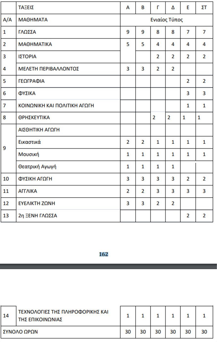 Η κατανομή των ωρών διδασκαλίας των μαθημάτων στα δημοτικά