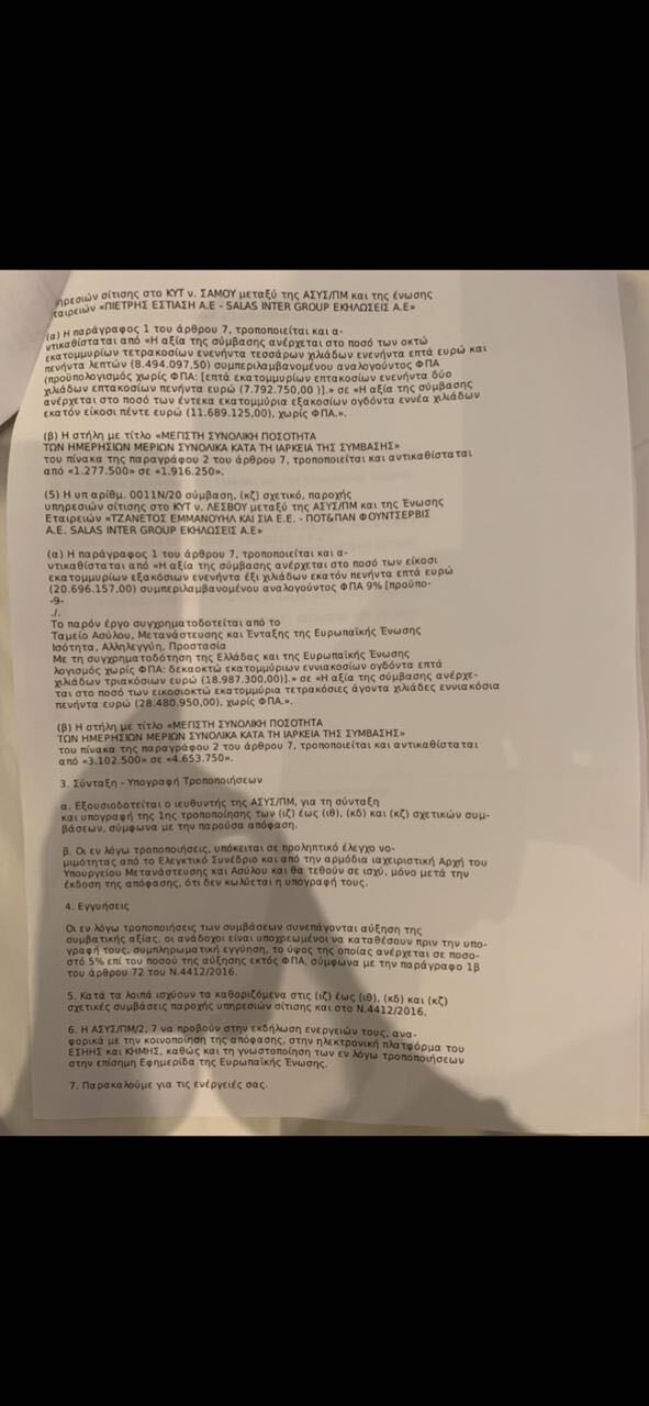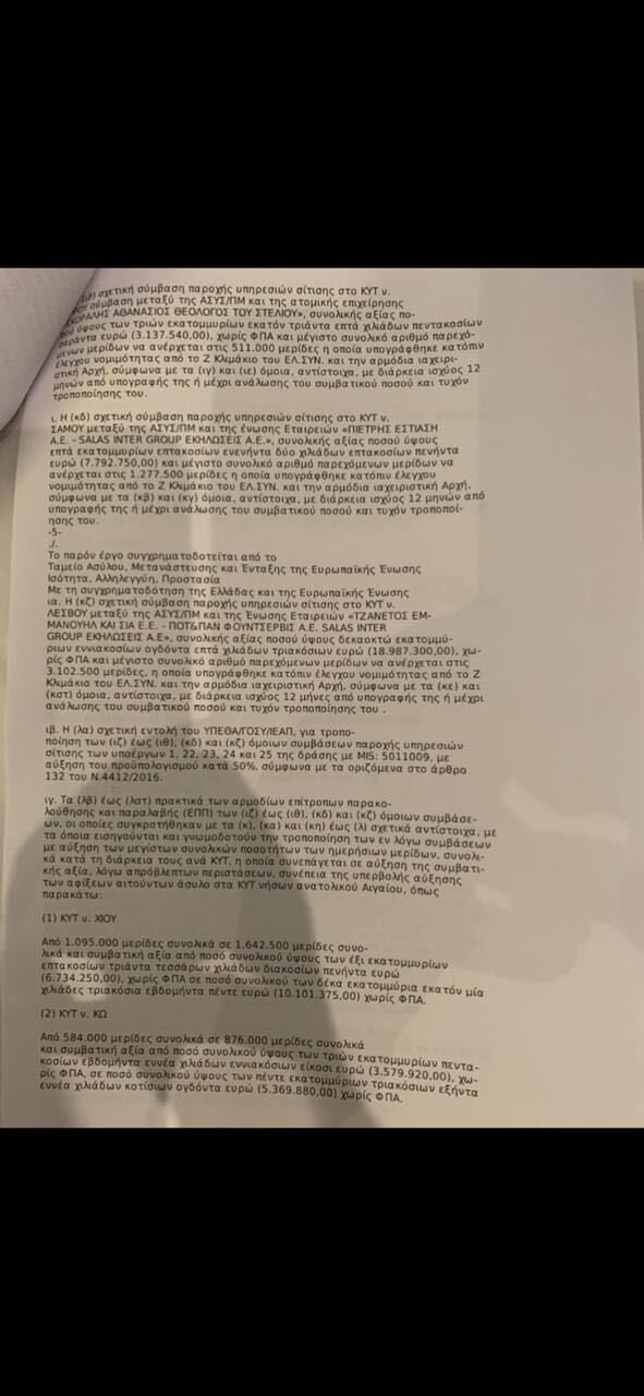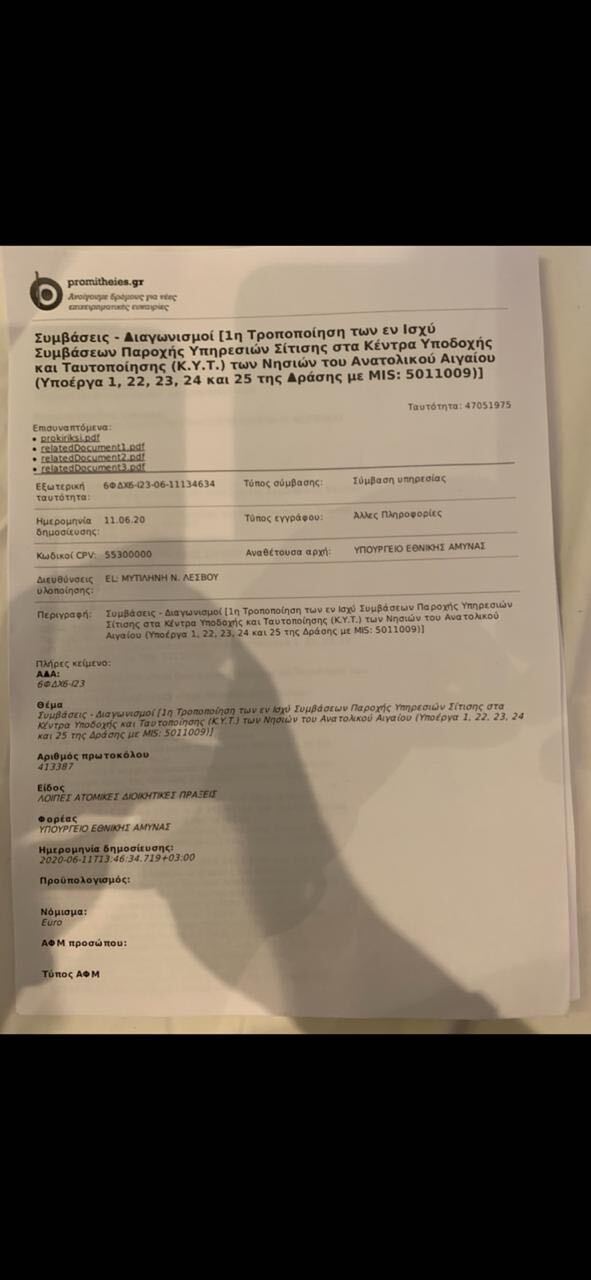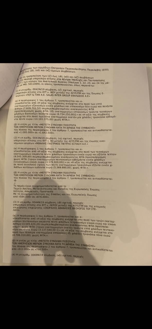 Οι αναθέσεις αυτές οι οποίες τροποποιήθηκαν πρόσφατα αυξάνοντας τις μερίδες φαγητού, κόστισαν περίπου άλλα 20,1 εκατομμύρια ευρώ στους Έλληνες & Ευρωπαίους φορολογουμένους. Συνολικά έχουν δαπανηθεί περίπου 60 εκατομμύρια ευρώ για την σίτιση παράνομων μεταναστών στις δομές Λέσβου, Λέρου, Σάμου, Χίου και Κω.