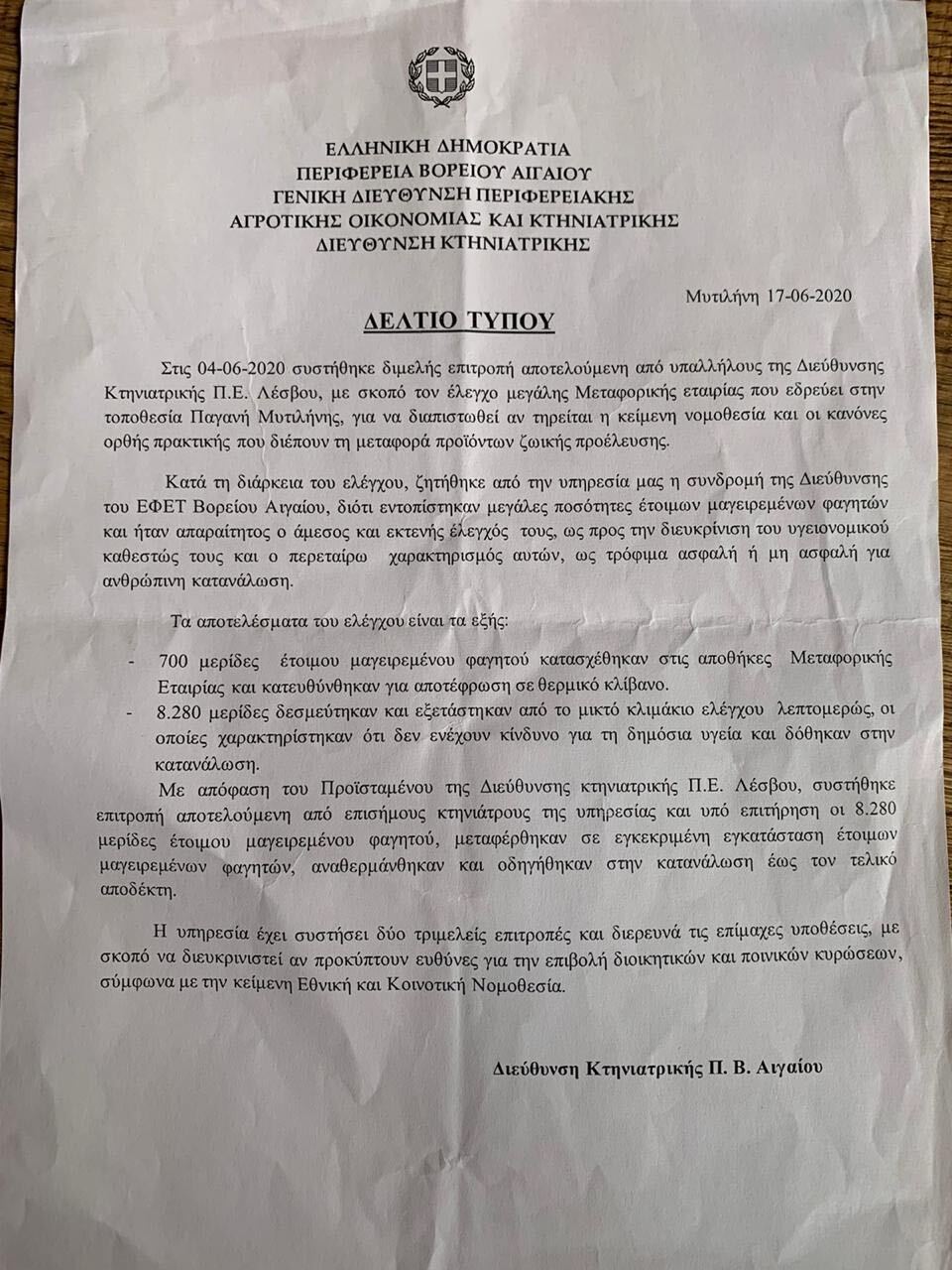 Σύμφωνα με καταγγελία της κτηνιατρικής υπηρεσίας Λέσβου έγινε έλεγχος σε έτοιμο φαγητό που προορίζονταν σε δομές και κατασχέθηκαν περίπου 700 μερίδες.