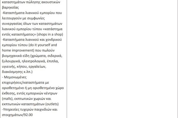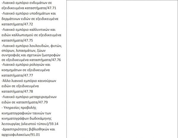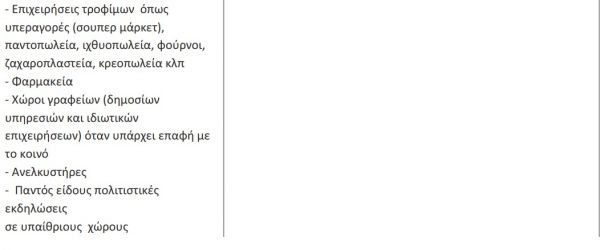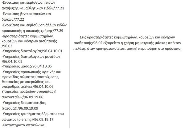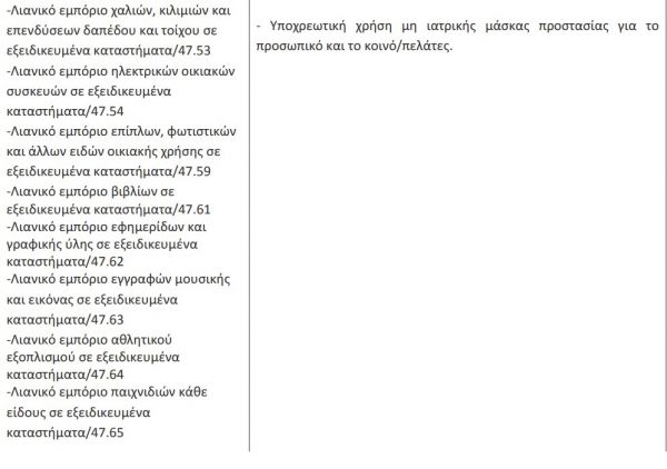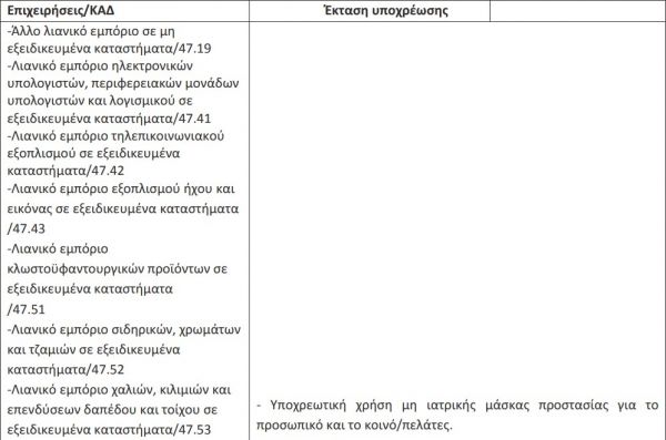 Σε εμπορικές επιχειρήσεις, επιχειρήσεις παροχής υπηρεσιών, χώρους γραφείων (δημοσίων υπηρεσιών ή ιδιωτικών επιχειρήσεων) και άλλους κλειστούς και ανοιχτούς χώρους συνάθροισης κοινού, όπως εξειδικεύονται στον κατωτέρω πίνακα, μη συμπεριλαμβανομένων πάντως των χώρων εστίασης, επιβάλλεται η υποχρέωση χρήσης μη ιατρικής μάσκας, στο πλαίσιο των έκτακτων μέτρων αντιμετώπισης του κινδύνου διασποράς του κορωνοϊού cOvID-19, ως εξής: