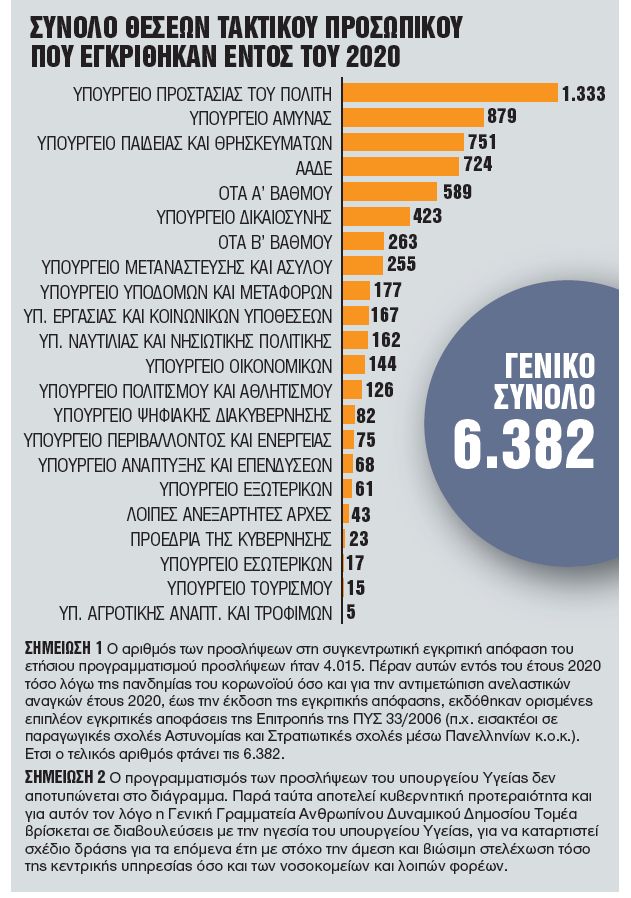 Προ δεκαημέρου, οι αρμόδιοι υπουργοί ενέκριναν για πρώτη φορά με μια συνολική εγκριτική απόφαση 4.015 προσλήψεις στο πλαίσιο του ετήσιου προγραμματισμού για εφέτος, ενώ συνολικά για το έτος 2020 έχουν εγκριθεί 6.385 προσλήψεις.