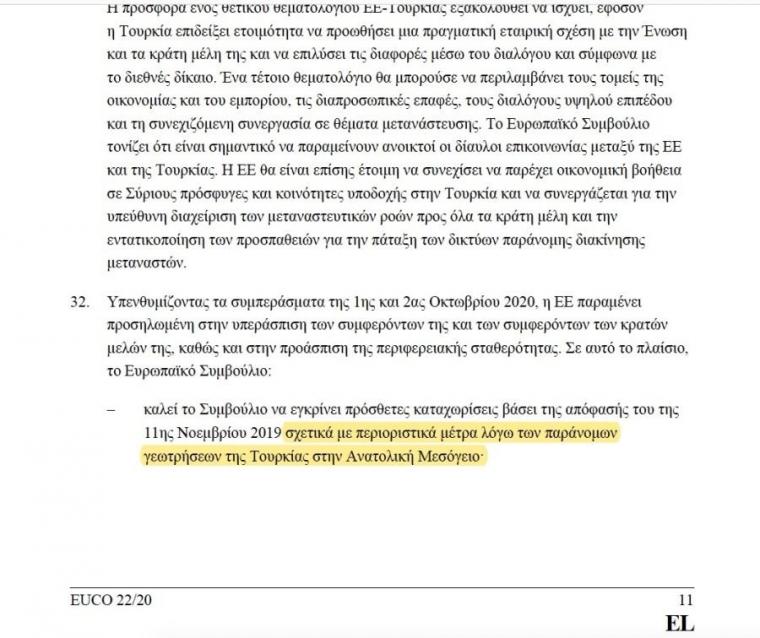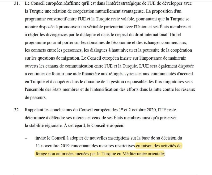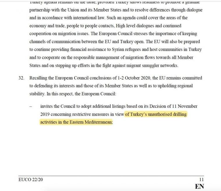 Ειδικότερα, στο ελληνικό κείμενο αναφέρεται ότι «το Ευρωπαϊκό Συμβούλιο: καλεί το Συμβούλιο να εγκρίνει πρόσθετες καταχωρίσεις βάσει της απόφασής του της 11ης Νοεμβρίου 2019 σχετικά με περιοριστικά μέτρα λόγω των ΠΑΡΑΝΟΜΩΝ γεωτρήσεων της Τουρκίας στην Ανατολική Μεσόγειο».