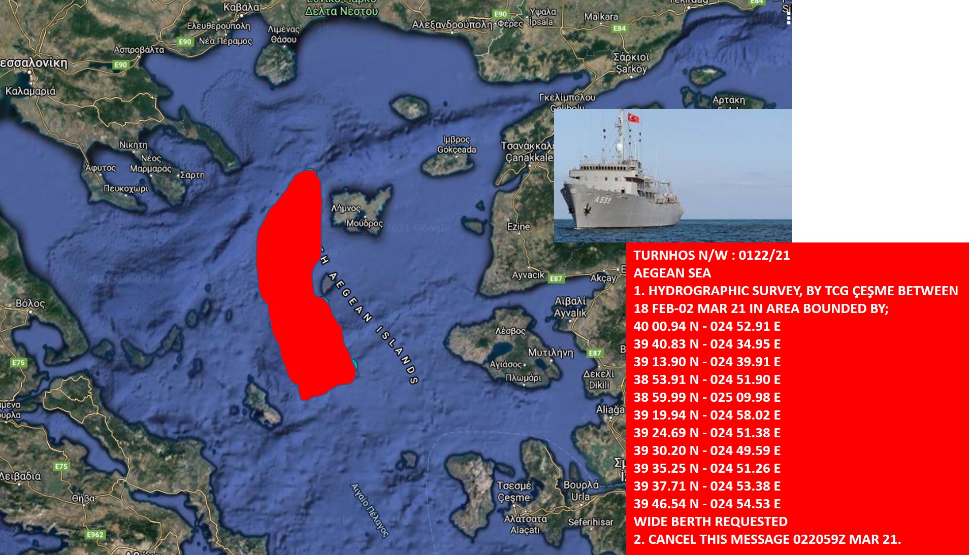 (Ανανέωση – Αρχικό κείμενο 16.25): Συνοδευόμενο από τουρκικά πολεμικά πλοία και τουλάχιστον ένα υποβρύχιο το ερευνητικό σκάφος του τουρκικού Ναυτικού TCG Cesme, εισήλθε εντός της ελληνικής υφαλοκρηπίδας και πλέον και πάλι στην καρδιά του Αιγαίου σε μία περιοχή, που το βόρειο τμήμα της απέχει ελάχιστα από τις ακτές της Χαλκιδικής και το νότιο τμήμα της απέχει την μισή απόσταση από την βορειοανατολική Εύβοια απ’ότι από τις μικρασιατικές ακτές!
