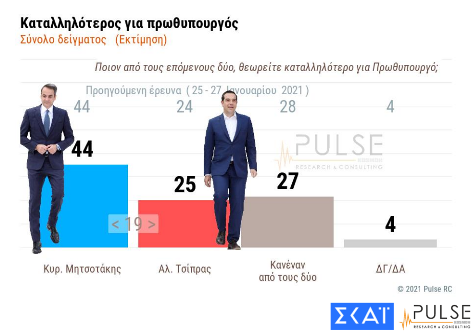 Το 44% των ερωτηθέντων θεωρούν καταλληλότερο για πρωθυπουργό τον Κυριάκο Μητσοτάκη έναντι του 25% που θεωρεί τον Αλέξη Τσίπρα.