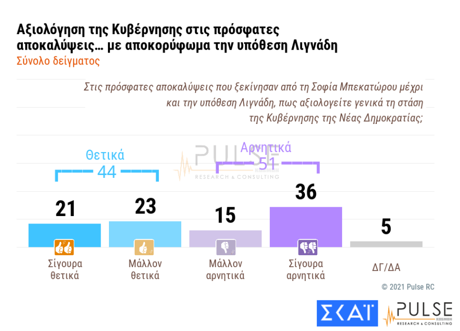 Κατόπιν αυτού του ποσοστού, το γεγονός ότι η ΝΔ έχει προβάδισμα 15%, είναι μια «μικρή» λεπτομέρεια, ορισμένα άλλα στοιχεία δε της δημοσκόπησης που προκαλεί ευφορία, είναι τα εξής: Το 44% εγκρίνει τους χειρισμούς της κυβέρνησης θετικά στην υπόθεση του παιδόφιλου Δημήτρη Λιγνάδη, ενώ οριακά το 51% τις κρίνει αρνητικά, δηλαδή το 44% θεωρεί ότι δεν έχει καμία ευθύνη η κυβέρνηση που διόρισε τον Λιγνάδη διευθυντή στο Εθνικό Θέατρο και εν συνεχεία τον κάλυπτε για 10 ημέρες.