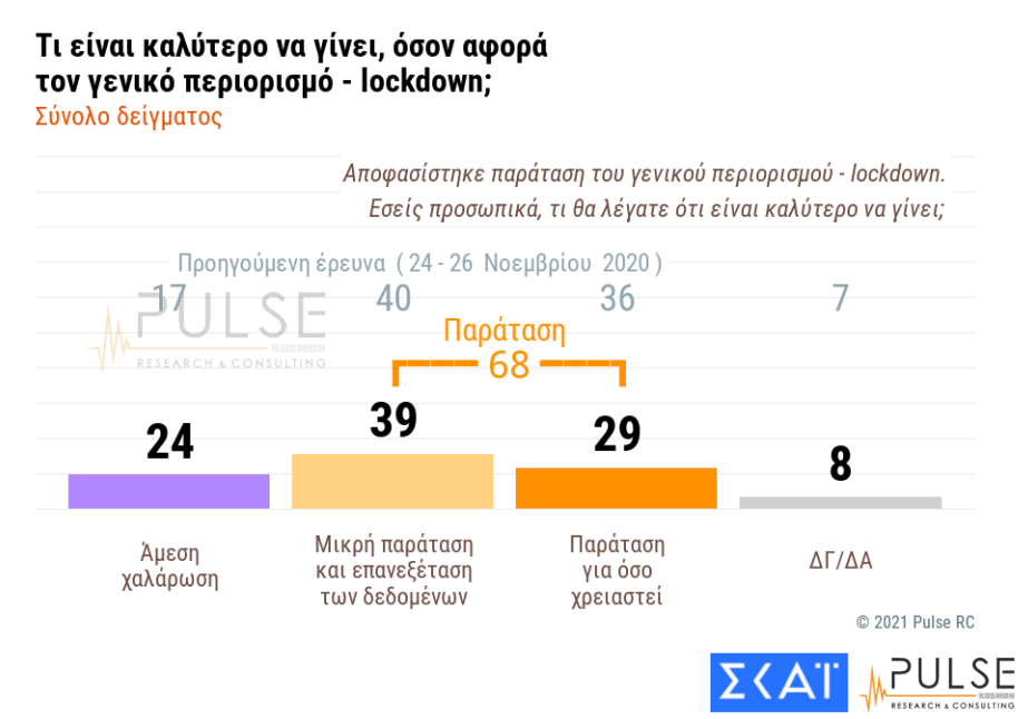Σύμφωνα με την δημοσκόπηση, που φέρει την υπογραφή της PULSE, το 68% των πολιτών θέλει να συνεχιστεί το lockdown στην χώρα για αρκετό καιρό ακόμα ή επ’ αοριστον (!).