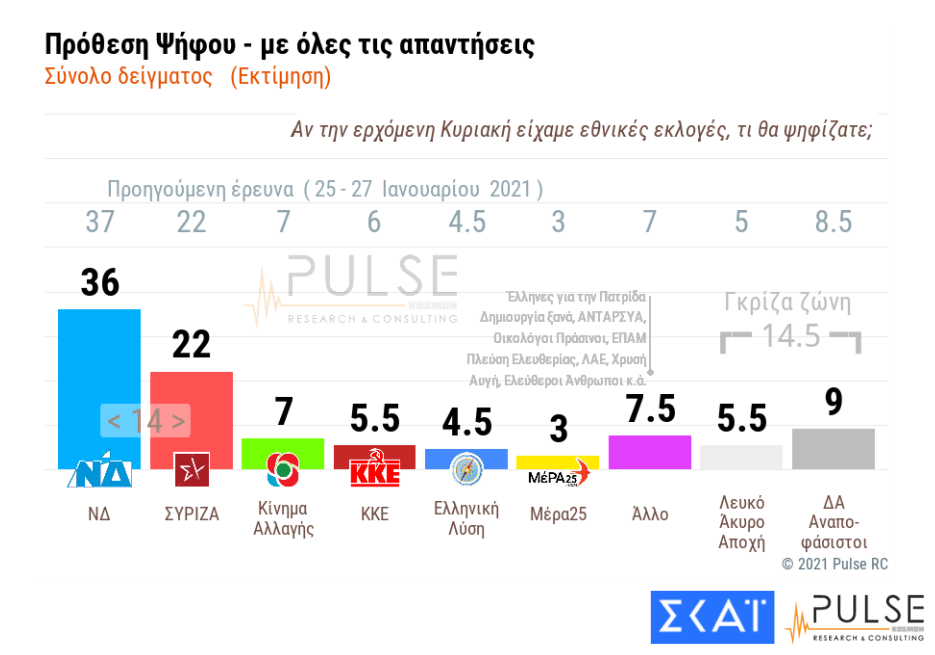 Τι θα ψήφιζαν οι πολίτες αν είχαμε εκλογές την ερχόμενη Κυριακή; Σε ποσοστό 38% θα ψήφιζαν Νέα Δημοκρατία, το 23% ΣΥΡΙΖΑ, το 7,5% Κίνημα Αλλαγής, το 6% ΚΚΕ, το 4,5% Ελληνική Λύση, το 3% ΜέΡΑ 25.