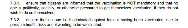 7.3.1. – να διασφαλίσουν πως οι πολίτες ενημερώνονται ότι ο εμβολιασμός δεν είναι υποχρεωτικός και ότι κανείς δεν πρέπει να υποστεί πίεση με πολιτικά, κοινωνικά ή άλλα μέσα, προκειμένου να εμβολιαστεί, εάν δεν το επιθυμεί.
