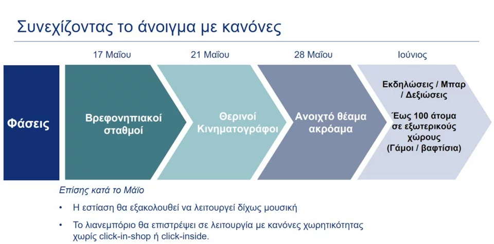 Πηγή από το υπ. Ανάπτυξης και Επενδύσεων ανέφερε στο iefimerida.gr ότι «ο υπουργός Αδωνις Γεωργιάδης βρίσκεται σε ανοιχτή γραμμή με την επιτροπή λοιμωξιολόγων, ώστε να εξεταστεί το ενδεχόμενο αύξησης των ορίων και το να δοθεί το “πράσινο φως” για τη μουσική. Αυτό όμως μπορεί να γίνει σε δυο, τρεις, τέσσερις εβδομάδες, ή και περισσότερο, από σήμερα, ανάλογα πάντα με όσα προκρίνουν οι λοιμωξιολόγοι».