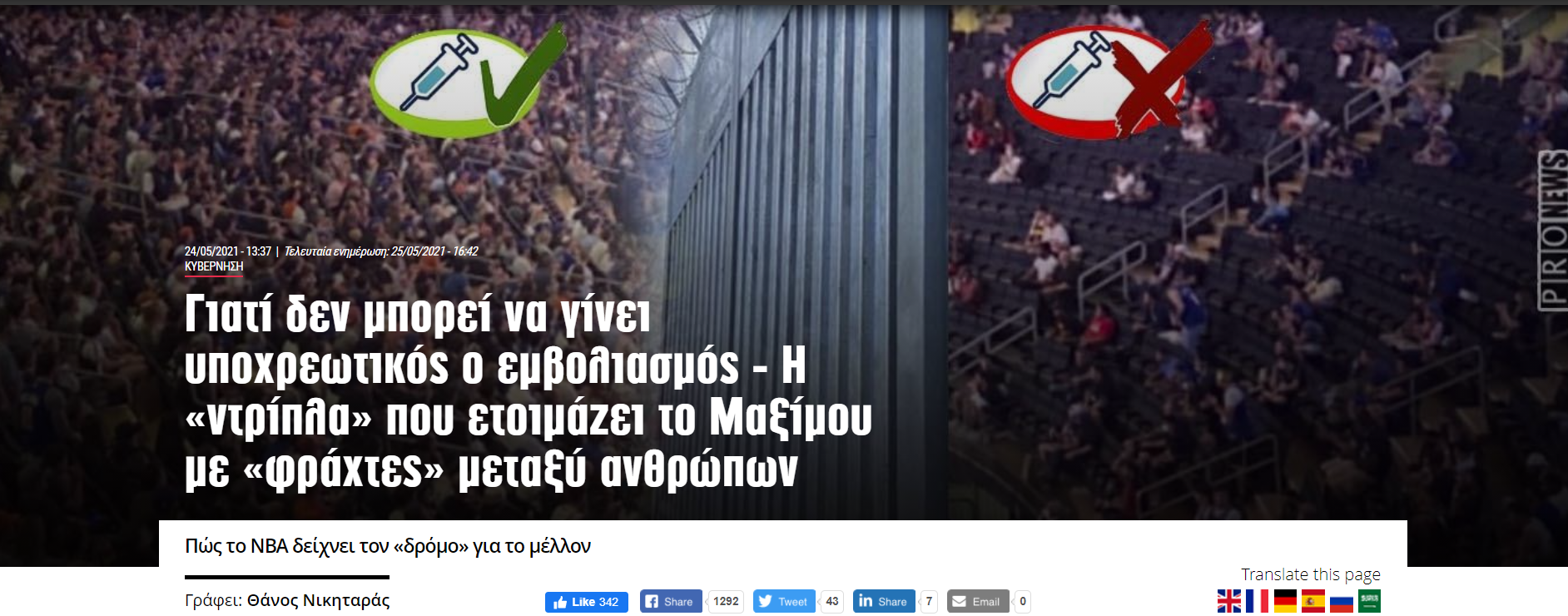 Παράλληλα είχαμε αναφέρει και το παράδειγμα της Νέας Υόρκης, εκεί που σε παιχνίδι ΝΒΑ ανάμεσα σε Νικς και Ατλάντα Χοκς υπήρχαν κερκίδες για εμβολιασμένους και μη.