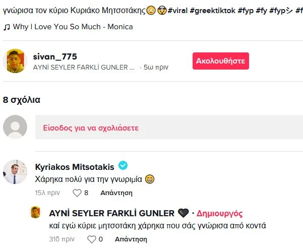 Όταν ανέβασε το βίντεο στο TikTok ο νεαρός, έγραψε ως περιγραφή «γνώρισα τον κύριο Κυριάκο Μητσοτάκη» και λίγο αργότερα, στα σχόλια δέχθηκε την «επίσκεψη» του Πρωθυπουργού, ο οποίος του έγραψε: «Χάρηκα πολύ για τη γνωριμία».