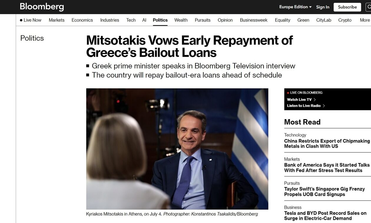Ο πρωθυπουργός Κυριάκος Μητσοτάκης δεσμεύτηκε πως η Ελλάδα θα αποπληρώσει ευρωπαϊκά δάνεια διάσωσης νωρίτερα από το χρονοδιάγραμμα, στέλνοντας μήνυμα αξιοπιστίας προς τις χρηματοπιστωτικές αγορές κατά την έναρξη της δεύτερης θητείας του,αναφέρει το Bloomberg.