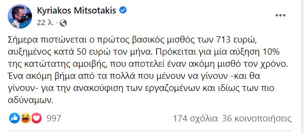 «Σήμερα πιστώνεται ο πρώτος βασικός μισθός των 713 ευρώ, αυξημένος κατά 50 ευρώ τον μήνα. Πρόκειται για μία αύξηση 10% της κατώτατης αμοιβής, που αποτελεί έναν ακόμη μισθό τον χρόνο», έγραψε ο πρωθυπουργός.