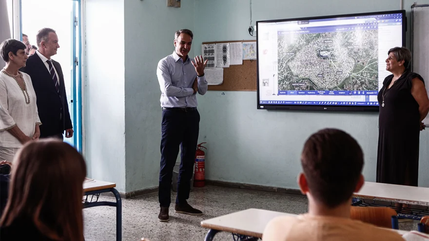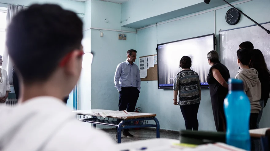 Όπως φαίνεται στις φωτογραφίες ο Κυριάκος Μητσοτάκης βρέθηκε σε μια σχολική αίθουσα με διαδραστικό πίνακα διδασκαλίας και συνομίλησε με μαθητές.