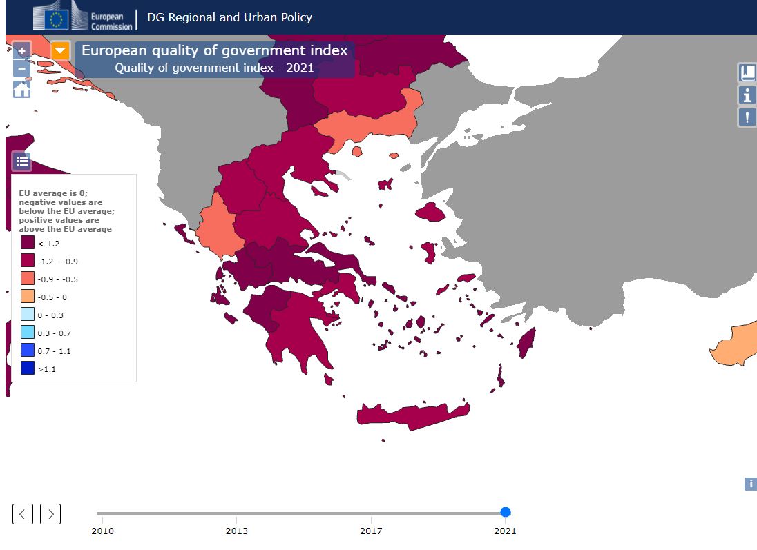 Συγκεκριμένα, ο Ευρωπαϊκός Δείκτης Ποιότητας της Κυβέρνησης (EQI) καταγράφει τις εμπειρίες των μέσων πολιτών σε ορισμένους τομείς που σχετίζονται: με τη διαφθορά, την ποιότητα και την αμεροληψία τριών βασικών δημόσιων υπηρεσιών – υγείας, εκπαίδευσης και αστυνόμευσης – στην περιοχή διαμονής τους, και τα παρουσιάζει από το 2010. Η έρευνα του 2021 συγκέντρωσε στοιχεία, κατάγραψε απόψεις και διαπίστωσε καταστάσεις σε μία σειρά από τομείς σε κάθε περιοχή: για τη δημόσια φροντίδα υγείας, την εκπαίδευση και την επιβολή του νόμου. Στην έρευνα συμμετείχαν 129.000 ερωτηθέντες από 208 περιοχές στα 27 κράτη – μέλη της ΕΕ.