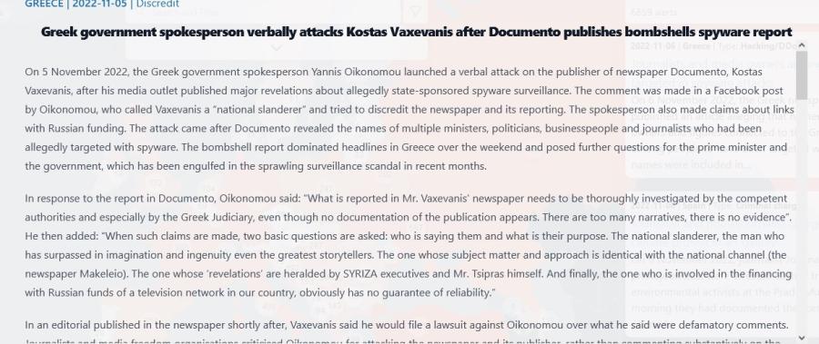 Το IPI στο πρώτο alert, κάνει εκτενή αναφορά στο χρονικό των αποκαλύψεων με τα 33 ονόματα πολιτικών δημοσιογράφων και επιχειρηματιών και εστιάζει ιδιαίτερα στο πως αυτές αντιμετωπίστηκαν από τον πλέον αρμόδιο κυβερνητικό εκπρόσωπο και εκπρόσωπο του Κυριάκου Μητσοτάκη.