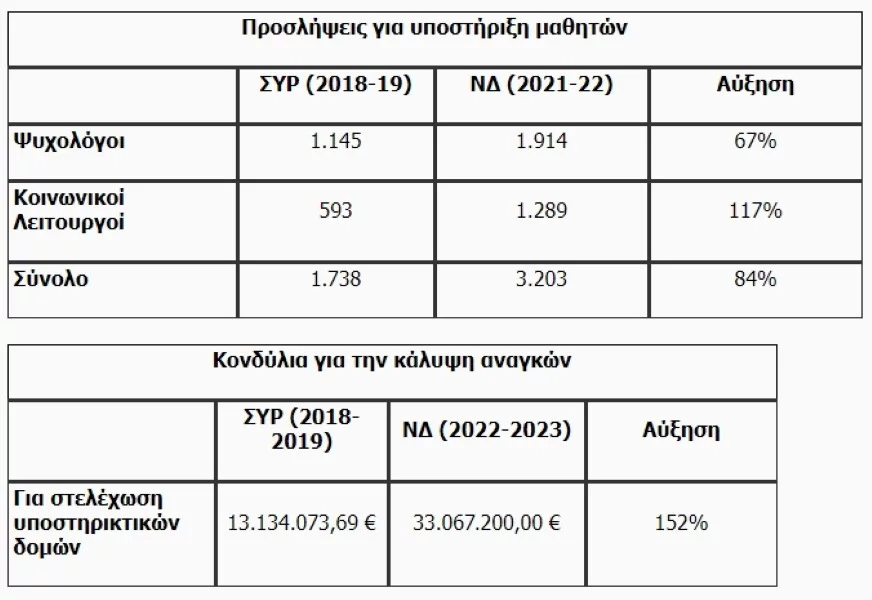 »Επιπλέον, μόνο κατά το προηγούμενο σχολικό έτος (2021-2022), επιμορφώθηκαν πάνω από 125.000 εκπαιδευτικοί σε προγράμματα που αφορούσαν, ανάμεσα σε άλλα, και τις σύγχρονες μεθοδολογικές προσεγγίσεις όπως τα «Εργαστήρια Δεξιοτήτων». Παράλληλα, έχει θεσπιστεί ο σύμβουλος σχολικής ζωής – εκπαιδευτικός που καθοδηγεί και υποστηρίζει ομάδες μαθητών, διατέθηκαν οι περισσότεροι ψυχολόγοι και κοινωνικοί λειτουργοί από όλα τα προηγούμενα χρόνια για τη στήριξη της σχολικής κοινότητας, έχει συστηματοποιηθεί η συνεργασία με δομές όπως τα ΚΕΔΑΣΥ.